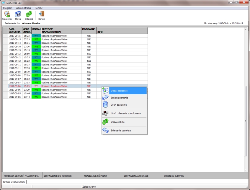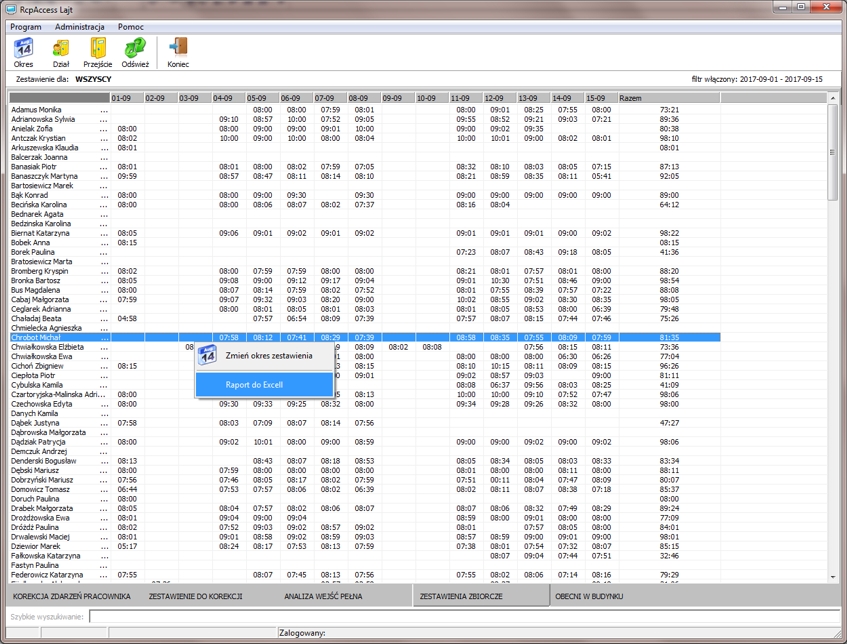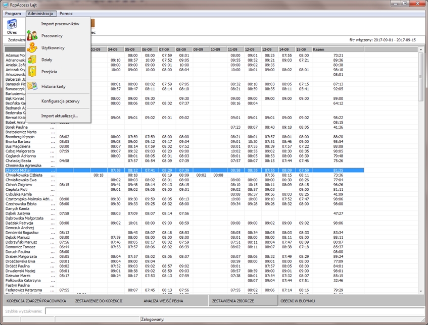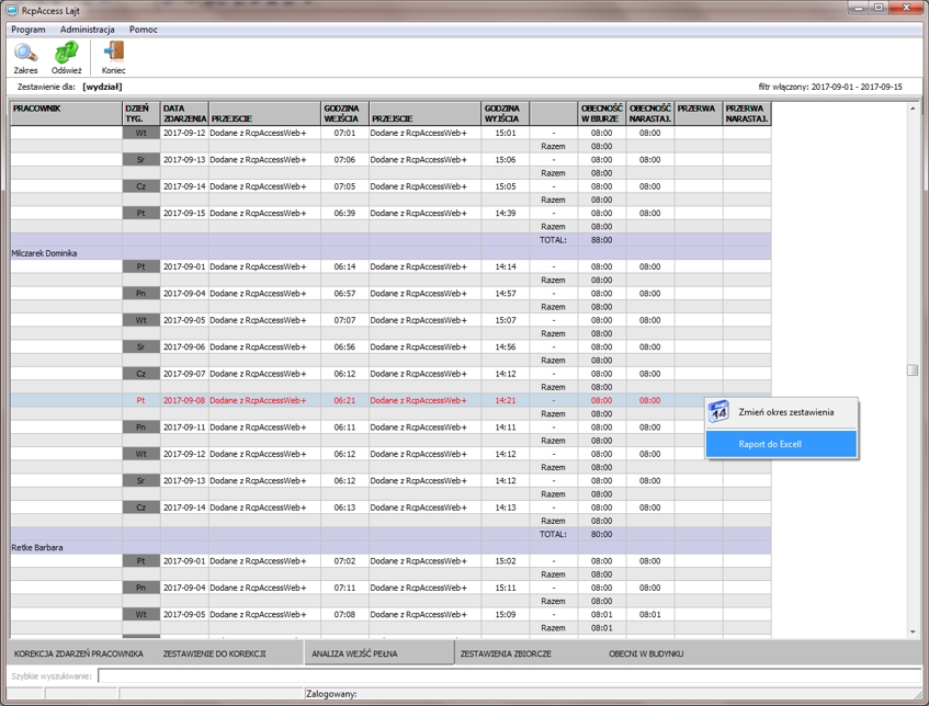 Program RcpAccessLajt da wgląd w wyniki działań pracowników na rejestratorze.