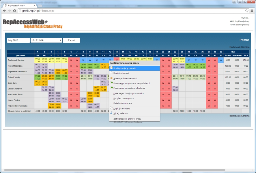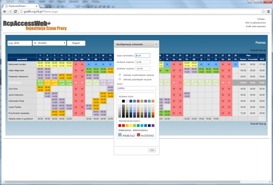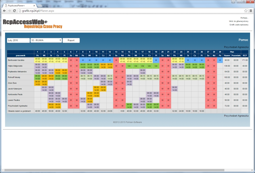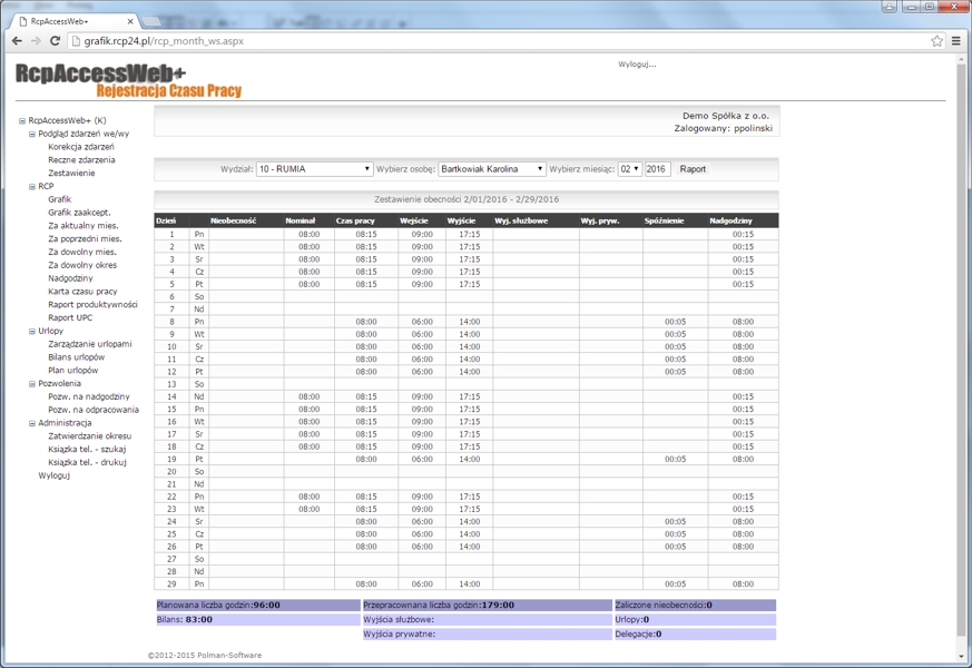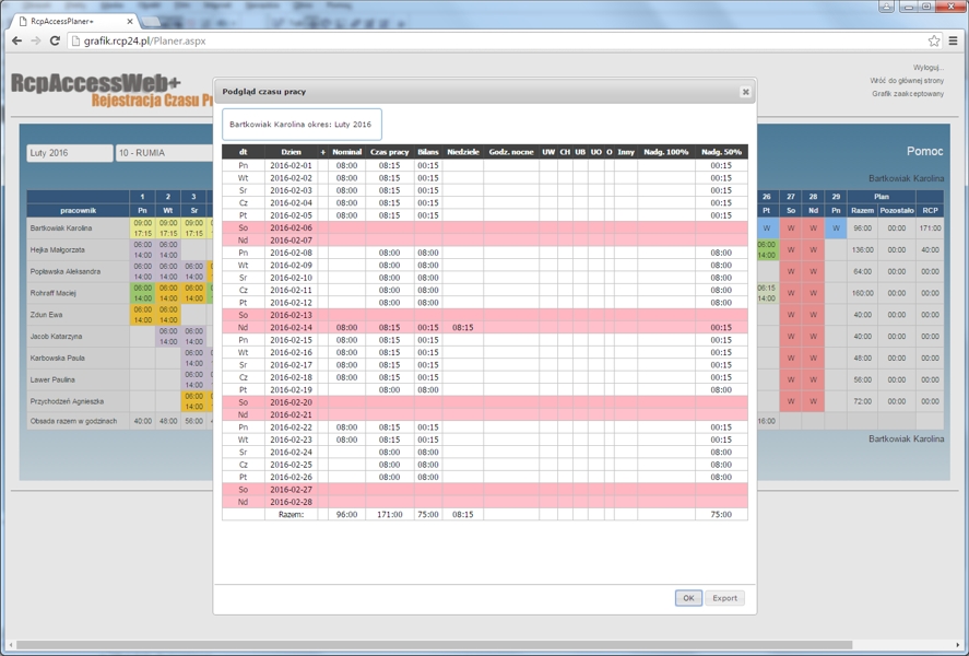 System Rejestracji Czasu Pracy Online, RcpAccessWeb+, umożliwia rozliczanie i prezentację czasu pracy, nadgodzin, urlopów i innych danych,